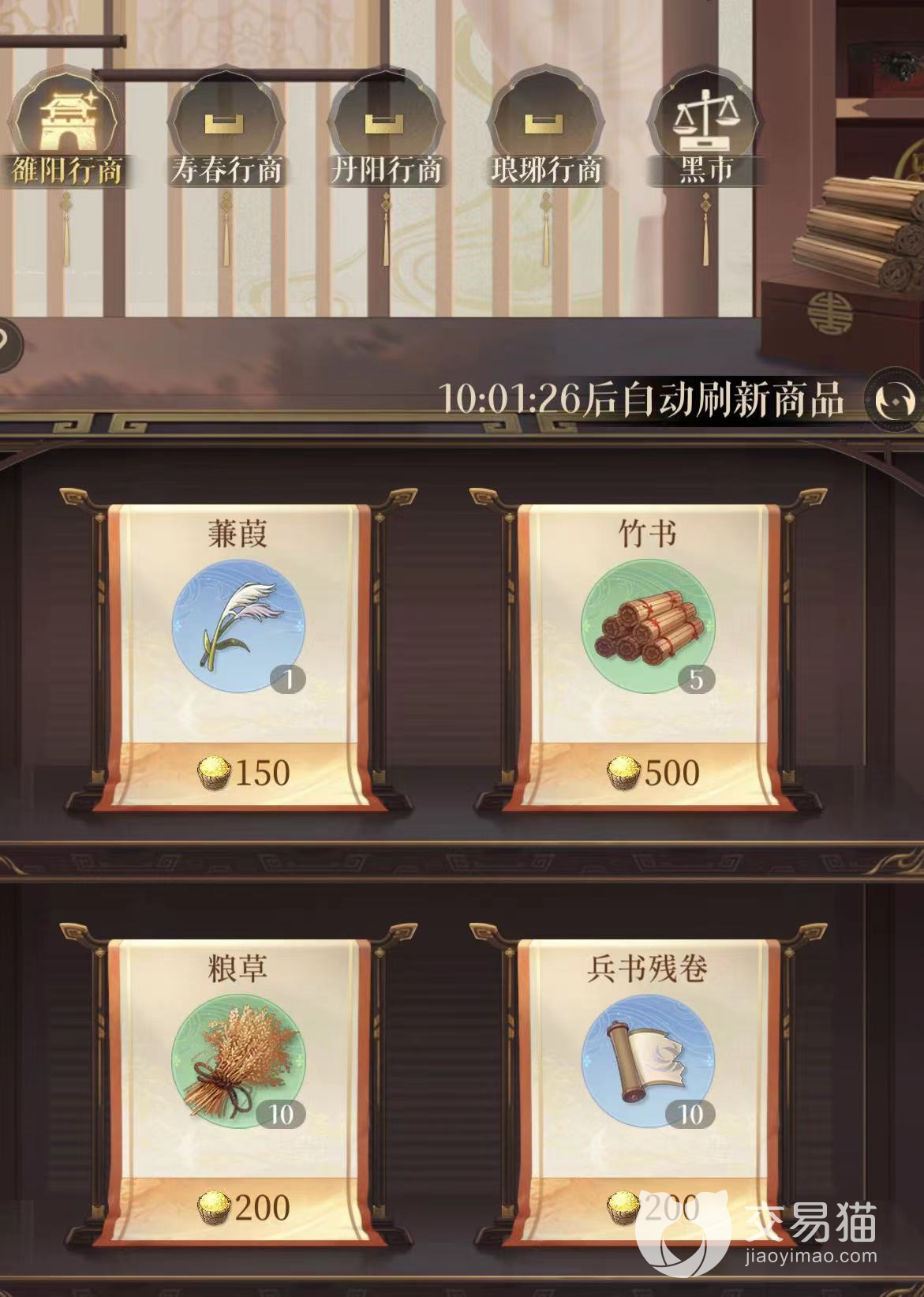 据点行商有四个,玩家需要提前解锁相对应据点才能看到行脚商人,商人处出售的竹书售价是500粟米5个,玩家每日收取据点、派遣队伍远征可获取大量粟米。同样也是非急用不建议兑换,小编比较推荐优先兑换心纸。