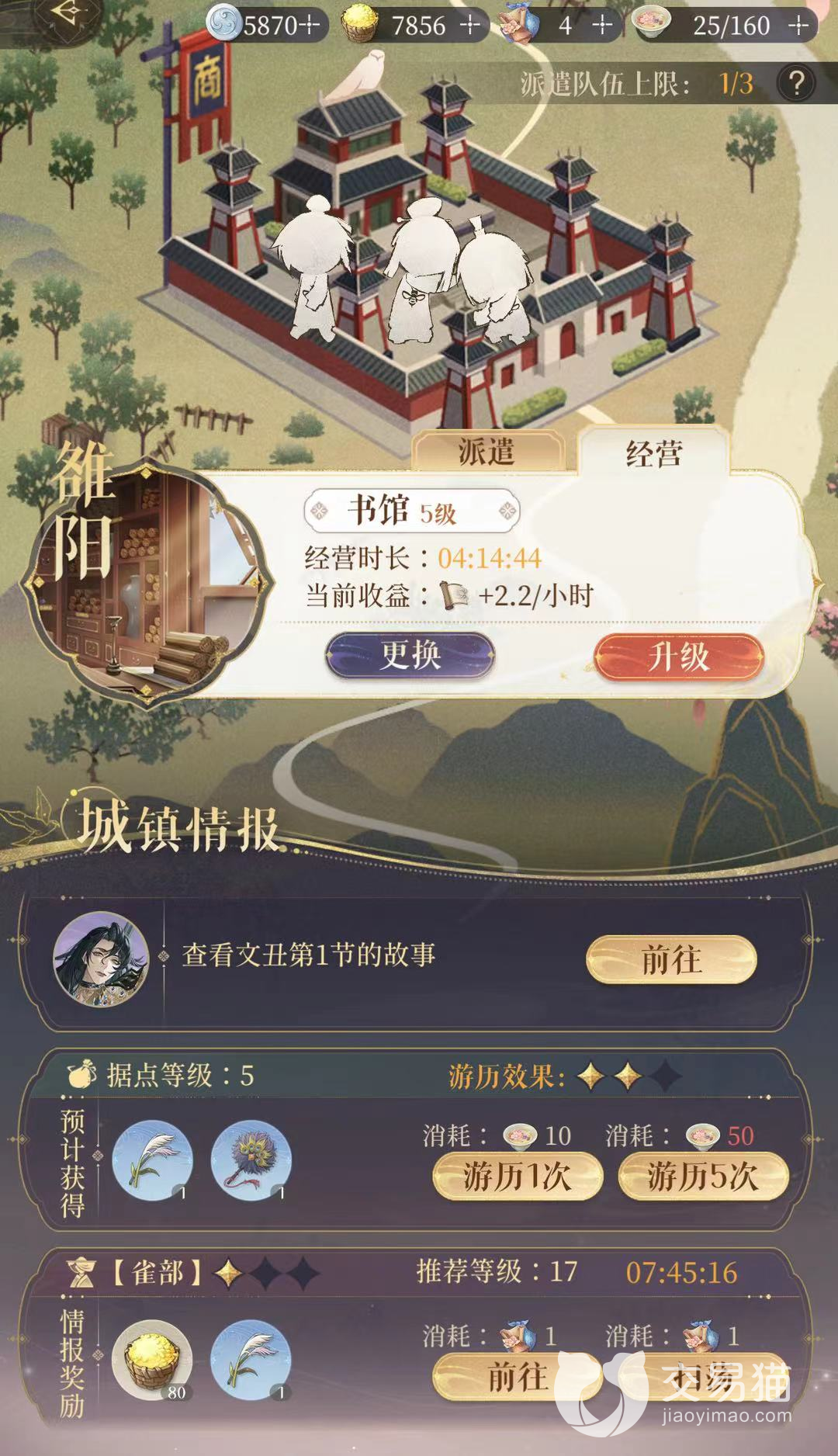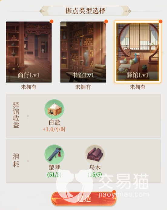 目前据点开放了广陵、雒阳、狼牙等11个据点,每个城镇都能选择经营的建筑,如商行、书馆、驿馆。建造书馆收取的物品是经验书,同时升级材料要求使用专属材料竹书。