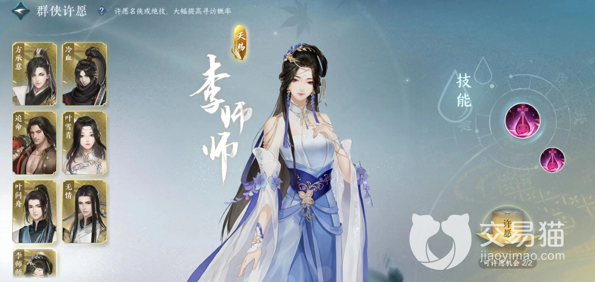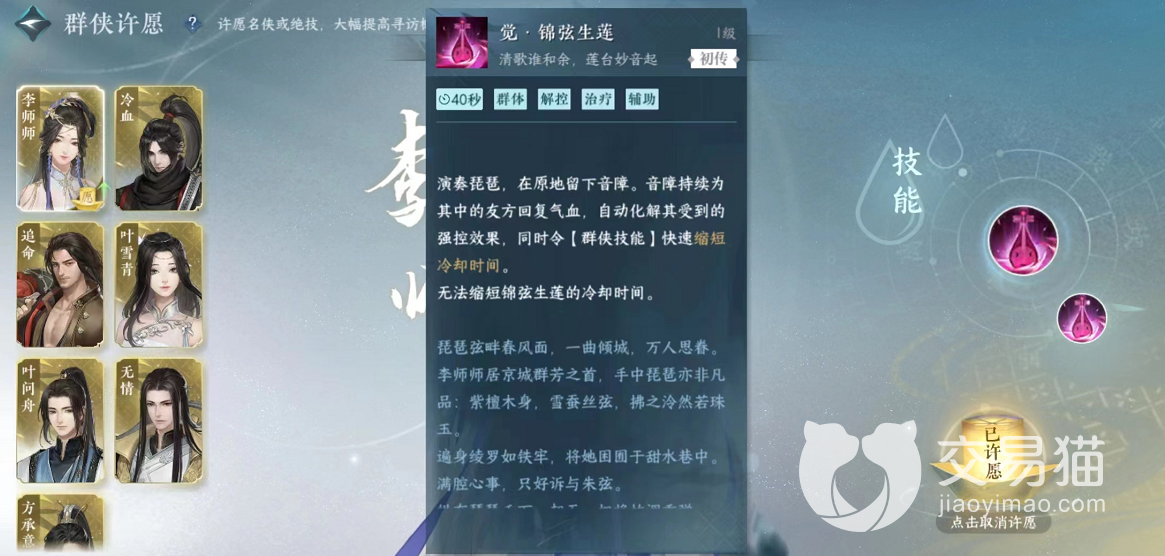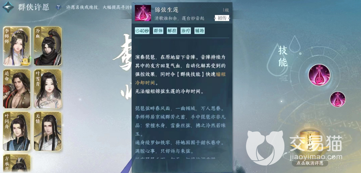 李师师一共拥有两个技能,每一个技能都能为我们带来非常可观的辅助收益,首先她的第一个技能为锦弦生莲,这个技能是一个群体辅助技能,可以进行治疗以及解控。在释放之后,李师师将在原地弹奏琵琶,可以为友方全体队员恢复一定的气血值,自动化解其受到的强控效果。而且她的群侠技能还能快速缩短技能使用的冷却时间,不过这个群侠技能有一定的针对性,只对输出队友有用,自身得不到一点的加持,玩家们也是要谨慎使用哦。