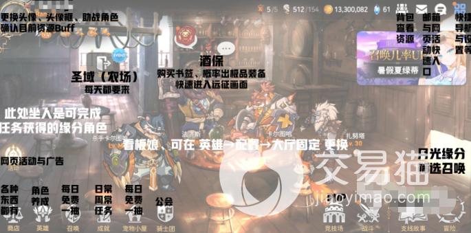 玩家在刚开始进入这个游戏中之后,要先认识一下大厅里面所有的功能以及设置。这也是对这个游戏的一种基础操作,对于新手来说非常重要。在左上角的位置有角色的头像,点击一下就可以更换自己想要的头像,还有助战的一些角色等等。并且在这个位置还有一些,现有资源的buff效果。在中间的位置是九堡这里可以购买书签,还有一些极品的装备,并且在这里还能快速体验远征的玩法。下面依次是商店,英雄,召唤,成就,宠物,还有骑士,这些功能都非常容易理解。