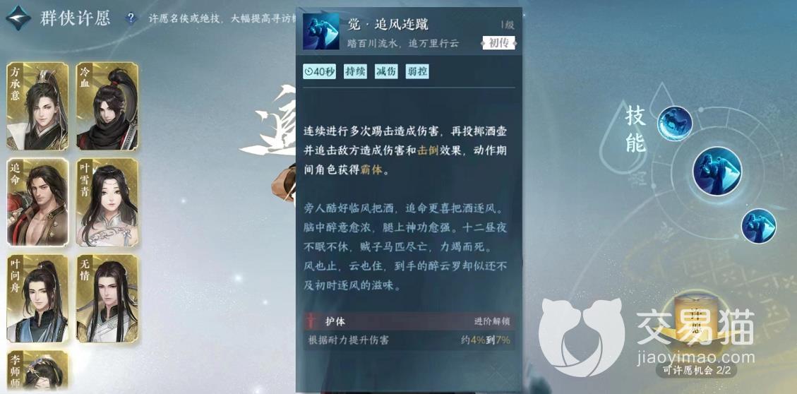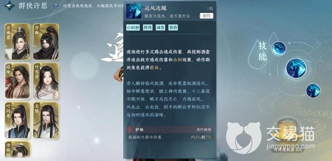 从外观上看,追命其实并没有其他几个角色看上去那么精致,但是这个角色却拥有一定的辅助解控能力,可以在游戏内处于一个屹立而不倒的位置。玩家们在获取之后就可以给其几个技能进行升级了,最值得升级的技能还是他的一技能为追风连蹴,这个技能可以进行持续伤害,拥有减伤以及弱控的能力,玩家们可以向目标释放多次连击,造成范围性攻击效果。