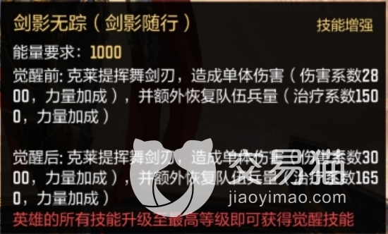 克莱缇是普攻型的传奇主将,主动技能“剑影随行”给对方目标造成伤害,并带有回复兵量的效果;觉醒后升级为“剑影无踪”,技能效果会更强,她的技能带有回复治疗的效果,在实战中可减少兵损。