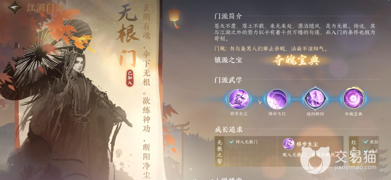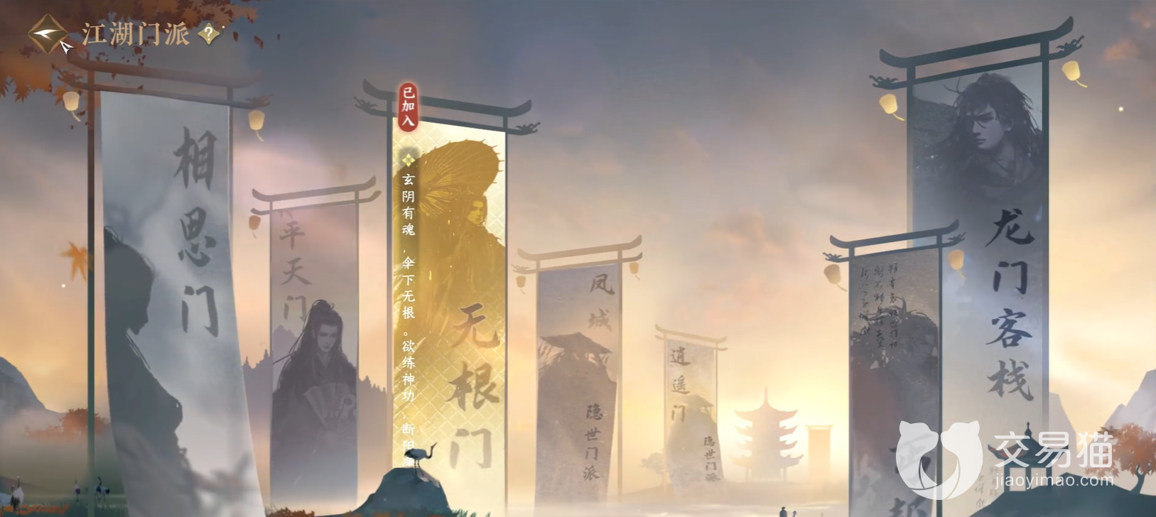 当加入一个门派的话,可以学四个武学,四个武学加起来的战力大概有100多点。目前,江湖门派有五个已经开放了,五个的话,加起来大概能获得500多点。在角色身份没有确定的目标时候可以先选择江湖门派。比如我们开始先选择无根门,他会对身份的装扮进行一个要求,达到一定要求,学完四个武学之后,就可以退出这个门派了。