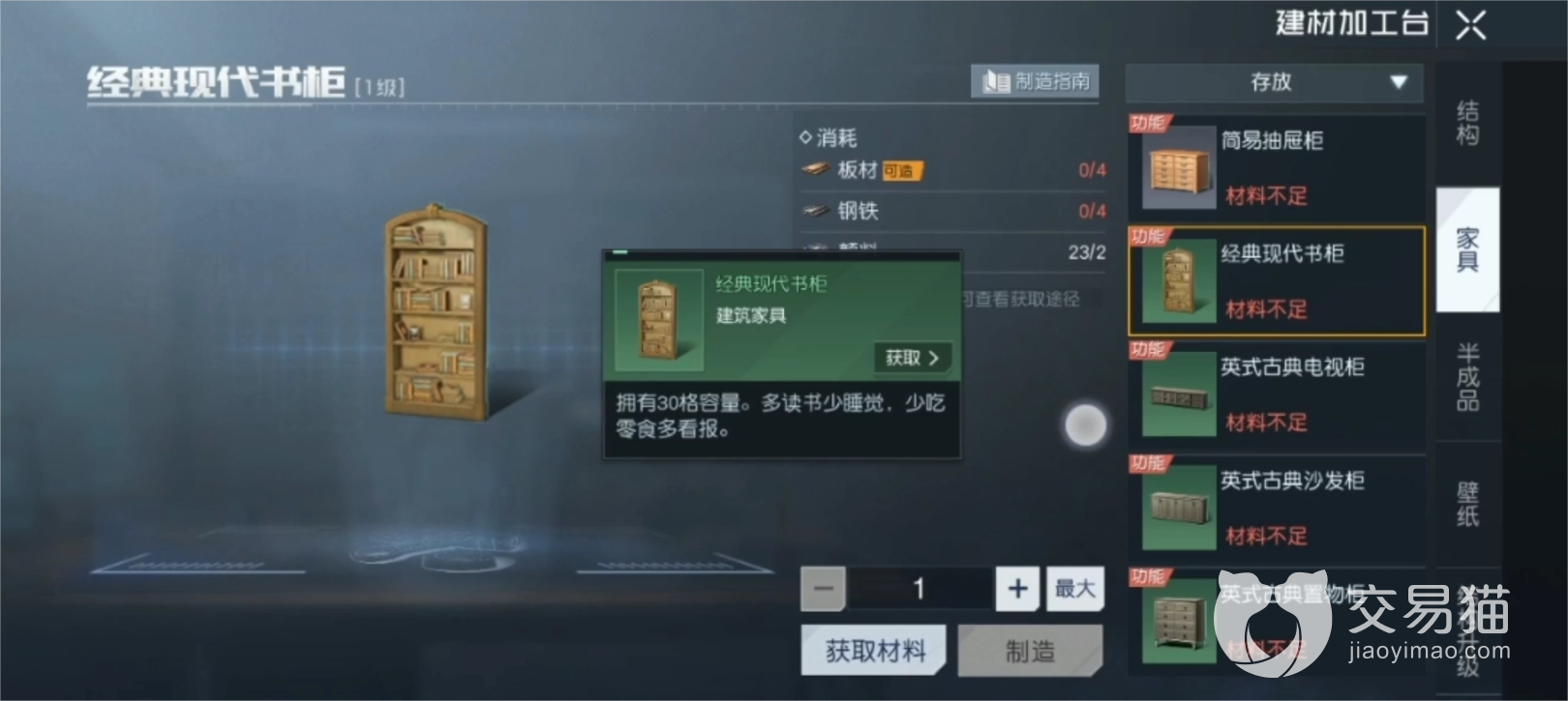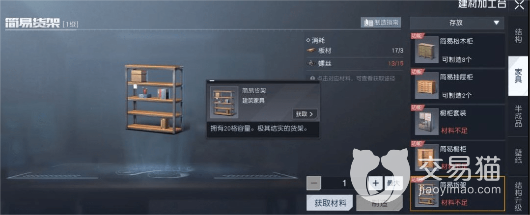 首先是第一种获取方式介绍,通过庄园解锁储物柜,在庄园一级时玩家就可以解锁简易的储物柜,比如简易货架、简易书柜、简易橱柜等等,这些储物柜的外观还不错,容量也并不少,并且这些都是一级庄园里可以获取到的,小伙伴们获取时难度也不大,柜子的制作方式只需要通过银币购买材料即可,这样制作出来的储物不仅美观,并且玩家还可以自由搭配自己喜欢的风格。