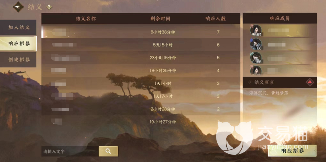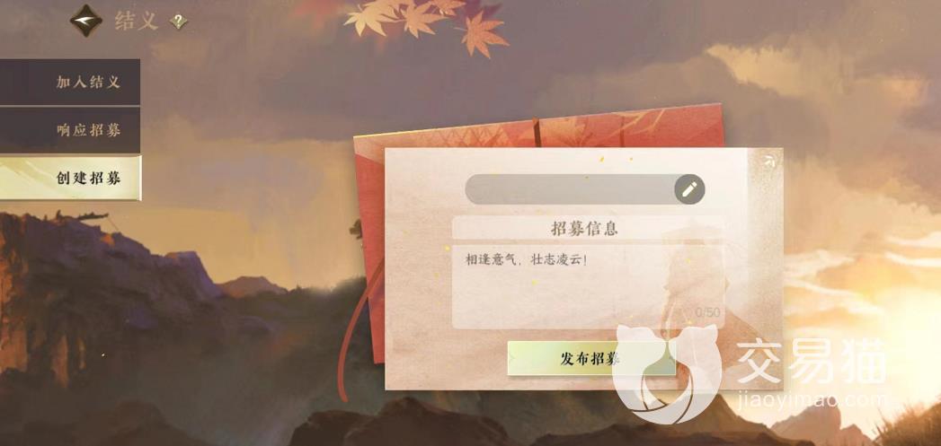 所谓的结义其实就是一个三到十人的团队,玩家们可以直接在结义板块进行响应招募,在集齐队伍之后,我们就可以前往雁门关靖边祠慕容梓处进行一义结金兰了。结义完成之后,发起结义的人默认为老大,之后会根据结义响应的时间前后来调整其他侠士的位次。成功结义完成我们还能解锁逍遥风物的兑换物资,还有更多外观趣味奖励,这些都是可以领取到的。关于招募,玩家们也需要注意一点,只有未结成关系的侠士才能响应他人的招募,如果玩家有特定的队伍,也可以自发的发起招募,等待其他玩家响应就可以了。