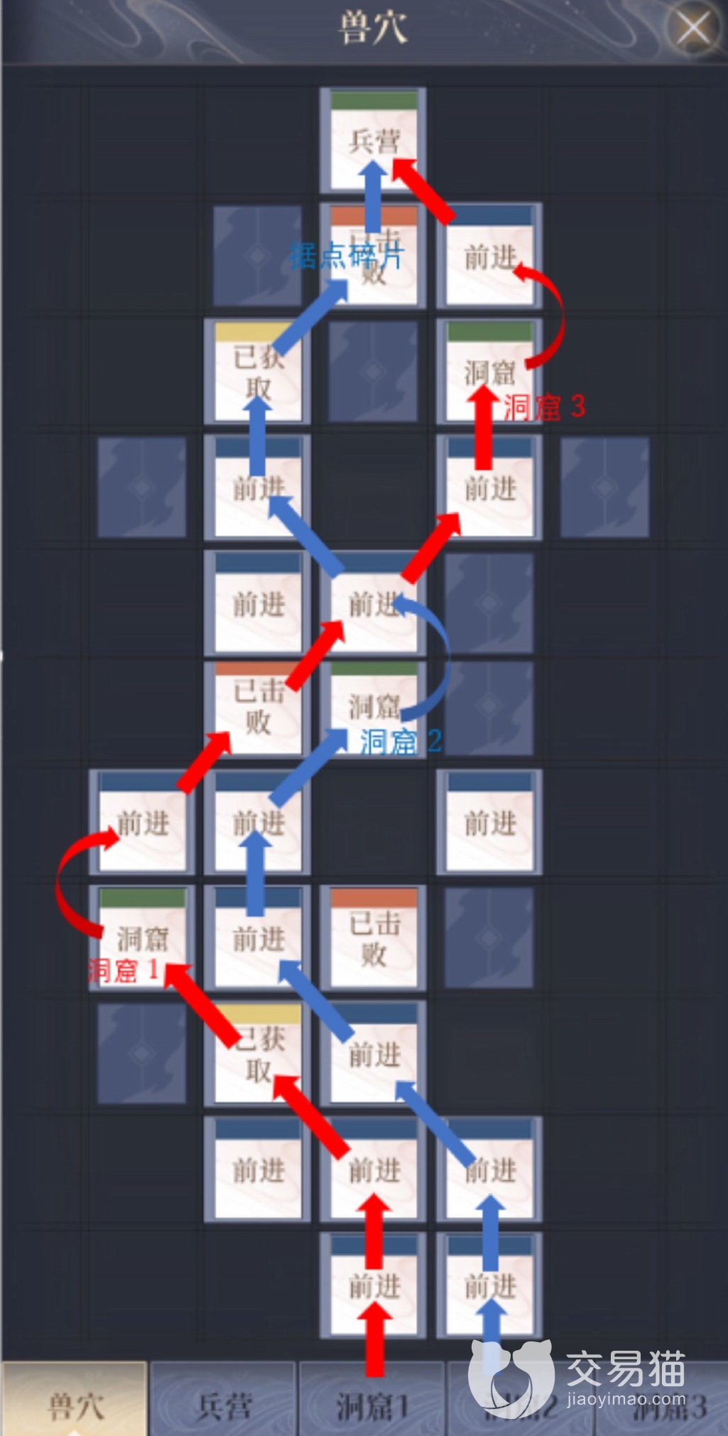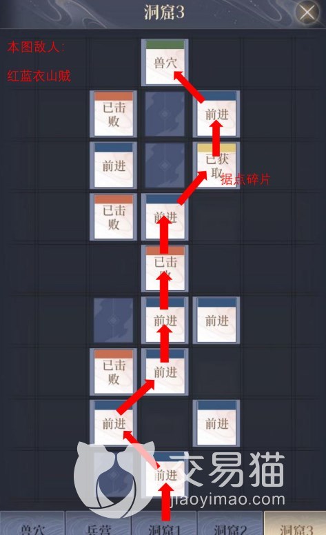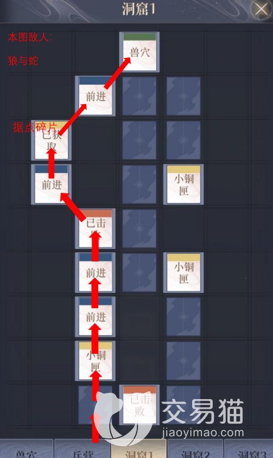 这里给大家分享两个路线,路线一先从兽穴出发,然后去洞窟1,然后再是兽穴,然后是洞窟3,再是兽穴,然后兵营,最后绣衣楼。路线二则是从兽穴前往洞窟2,再是兽穴,然后是兵营,最后绣衣楼。