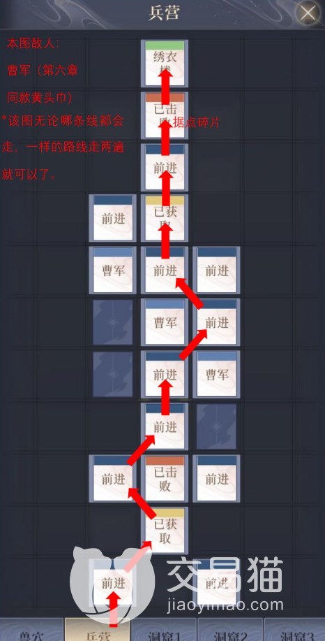兵营那一关的敌人是曹军,不管你是哪一天路线其实都会遇到,所以两个线路都走就行了。洞窟2前往荆棘丛的话,需要火把来点燃烧掉障碍物便能够通过。