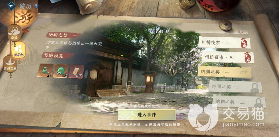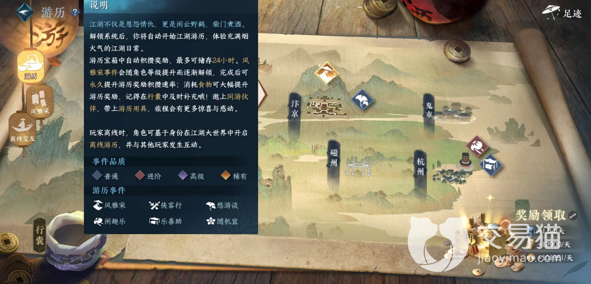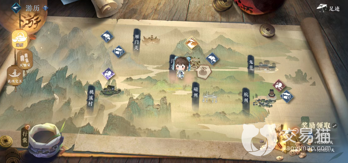 游历是一种趣味玩法,玩家们可以直接在菜单栏找到游历板块,点击进入之后,我们可以看到多个区域,在不同的区域,玩家们能够完成的任务都是不一样的,游历可以为我们解锁一定的交子、经验,还能帮助玩家获取更多的货币奖励。