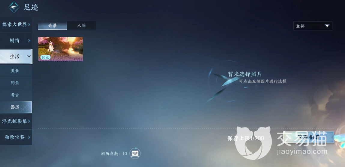 在足迹界面,玩家们还可以进行拍照。点击行囊可以装备一些材料,帮助玩家们在游历过程中应对各种特殊场景,而且游历还能为我们带来一些特殊的奇遇故事,这些都是很有趣的。