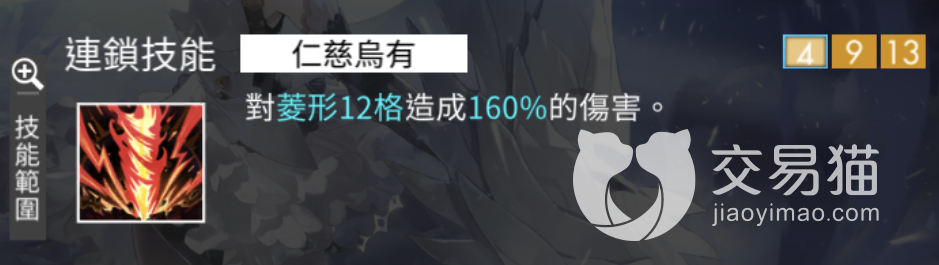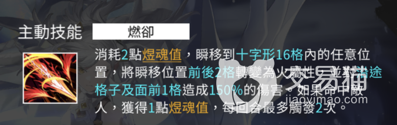 主动技能燃却,消耗蓝点能量可以瞬移到十字形16格内的任意位置,并且将瞬移的位置转变为火属性,背对沿途敌人以及面前一格之类的敌人,造成高额伤害,如果命中敌人还可以获得一点能量,每回合最多触发两次。真正的集一位移转色一体的复合技能,而且还有的充能的能力,加上开局就会拥有的充能,可以做到两连发。只要附近面前地格有敌人,可以再一次释放第二次主动积累。