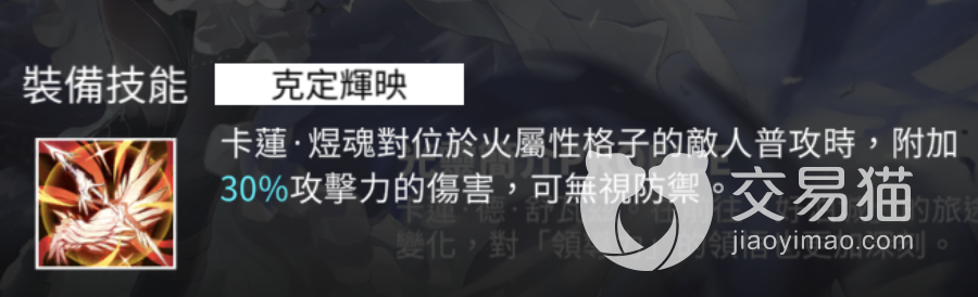 装备技能,看上去非常的简单,但非常的强,就是对处于火属性格子类型的敌人造成普通攻击时,可以再附加30%比例的真实伤害。注意,不是转成30%,而是附加伤害,这使得其面对一些高防类型的敌人也有着很高的输出。而且由于直接受到角色本身目前攻击力数值的影响,在面对一些1000以下600以上左右的敌人时,可以额外获得将近40%左右的增幅,所以这也是部分可以作为火卡莲爆破输出位的主要原因。