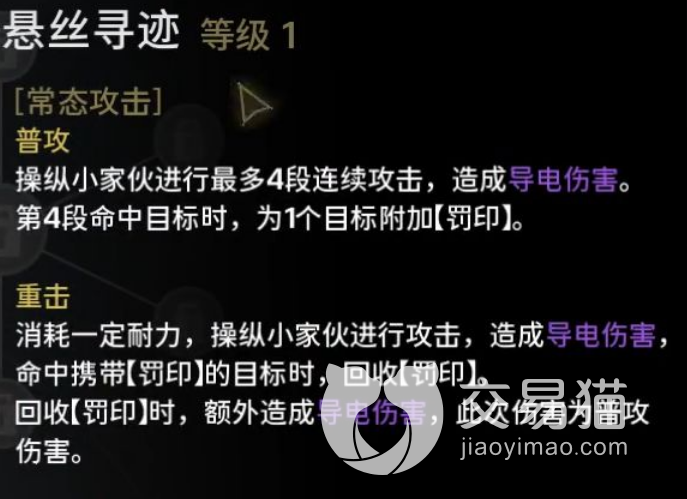 吟霖的话是一个新出的角色,他的共鸣属性是电属性,所以大家使用的时候基本上会为它搭配的武器是音感仪,这个角色的属性还是比较高的,他的常态攻击叫做悬丝寻迹,里面的普攻会讲到一个小家伙,也就是吟霖可以召唤出来帮助它战斗的一个小家伙,吟霖可以操纵小家伙进行一个四段的连续攻击,也就是一个四连击招式,造成的伤害还是带电的伤害,在这四段里面,只要其中一段命中敌方的话,那么就可以附加一个罚印的额外标记。