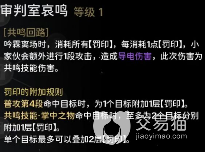 他的共鸣技能掌中之物会在命中目标的时候,为自己恢复一个罚印效果的同时,给对面再多附加一个罚印,也就是说对面最多可以叠加两层发音罚印,如果在开启共鸣之后,吟霖还可以在离场的时候消耗目前自己所有的罚印带来一次最后的电属性伤害,这个伤害是百分百会触发的,而且是被击杀之前最后一次额外的伤害,这一次伤害非常多,而且他的共鸣技能里面还有附加规则,也就是最后的攻击会选中更多的目标,所以还是建议大家在里面尽快升级共鸣技能。