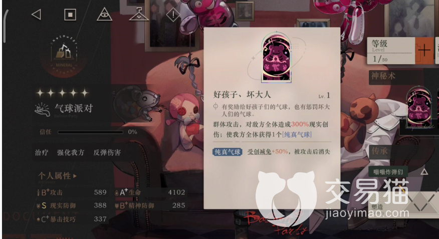 气球派对的相关技能,气球派对在游戏设定中是能全防御输出和治疗的一位角色,这归功于本身的属性以及技能效果。一技能效果是一个单体攻击,伤害很很高,并且在升级过程中伤害可以不断的叠加,二技能是一个群体治疗技能能够保护在场的所有队友的血量以及生命值,三技能是群体攻击技能,且这攻击技能在攻击敌人时敌人受到的伤害值越高反馈给本队伍的属性和提高就更加强大。