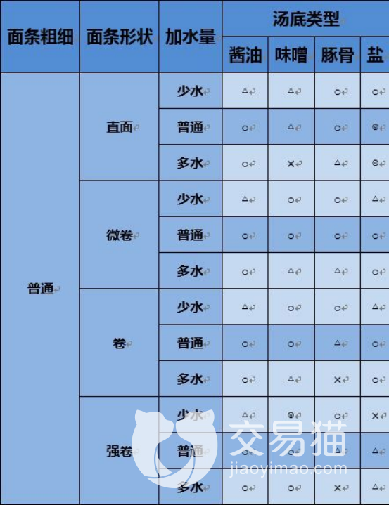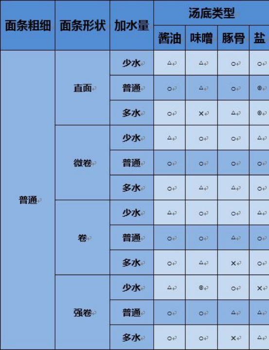 除了汤底以外,面条的制作也同样重要,面条分为极细,细,普通,粗和极粗。这些面条可以根据水量的控制来制作,面的分数也是和水量直接挂钩,所以制作面条时尽量选择好一些的水。