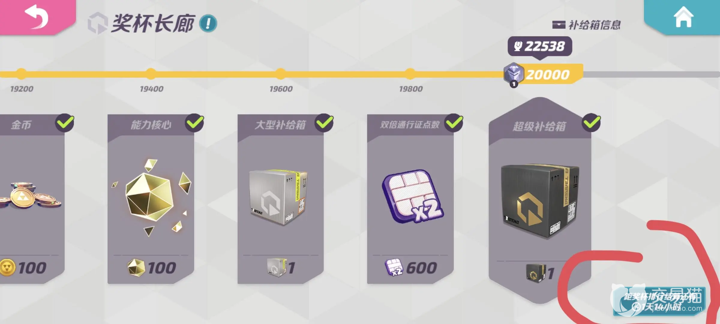 当你们的奖杯总数达到指定数额的时候,就能获取奖励,而在界面的右下方就会有结算倒计时,点开之后还能够看到结算时候自己能够获取到多少个荣誉徽章,它的可以用来到对应的商店中换取皮肤和其他的道具。