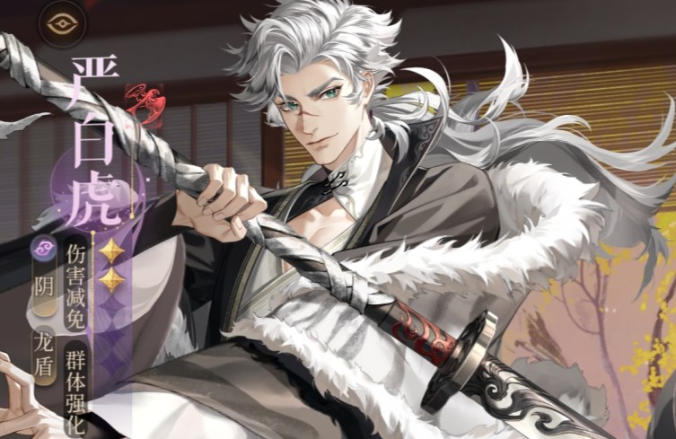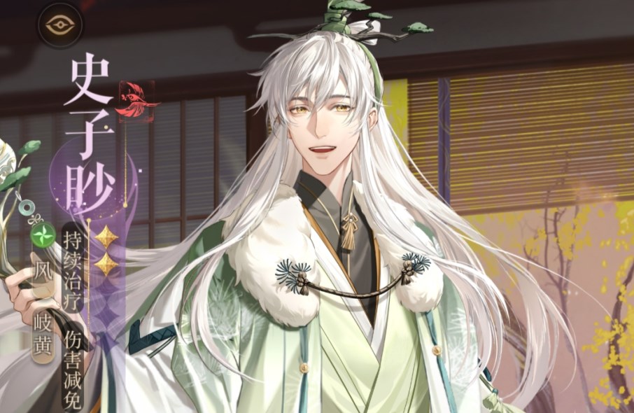 史子眇,俗称“狮子喵”,一头白发披肩,设定是个道士抚养年幼的刘辩,也是大家使用最多的奶妈,在各种阵容里都有亮相。还有一个严白虎也是白毛,是个护盾型的角色。