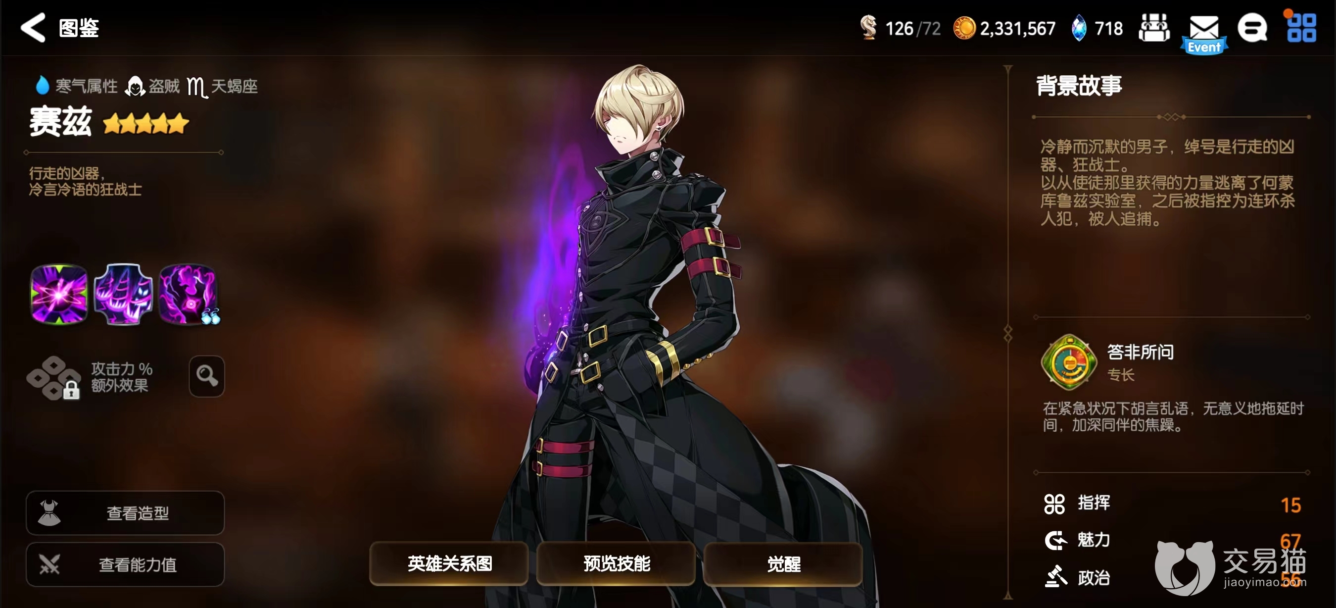 3.技能三定罪:对单个敌人造成高额伤害,如果目标死于该技能,赛兹就会发动追加攻击,对目标以外的所有敌人造成伤害。