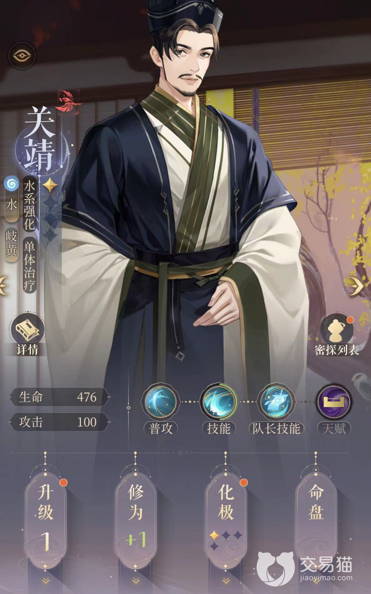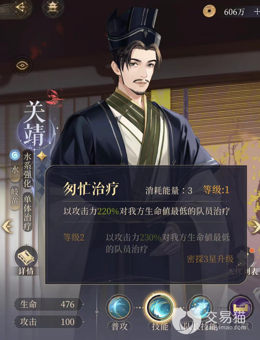 队长技能:匆忙安抚。提升全体水属性伤害20%,目前水属性的主输出角色是鲁肃,暂时没有特别需要提升水属性输出的关卡,所以一般不用关靖作为队长。