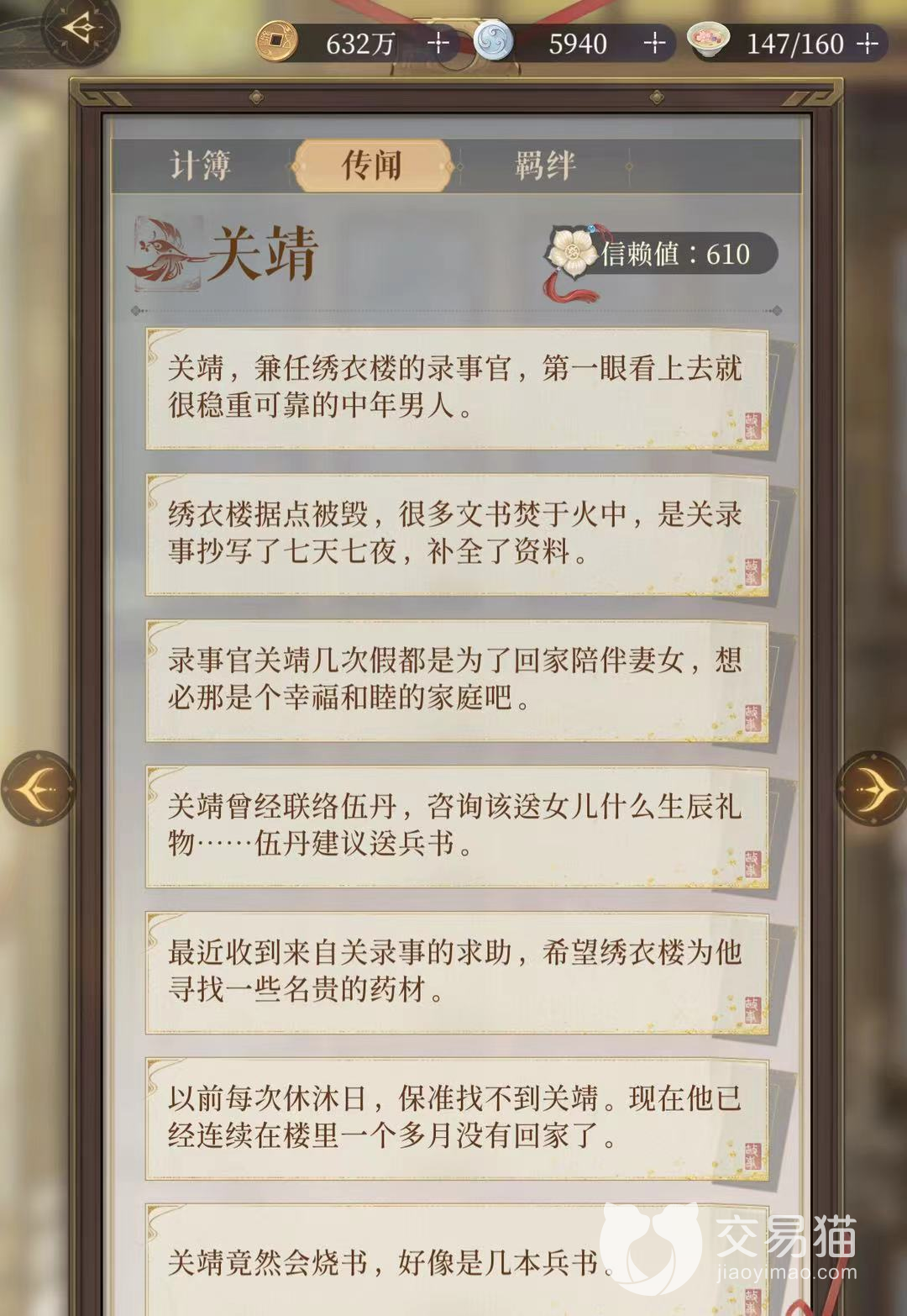 关靖是非常顾家的中年男人,在绣衣楼中兼任录事官,每逢节假日都会回家陪伴妻女,但是由于一些变故,家人遭逢不测,关靖准备送给女儿的兵书也只能烧毁。