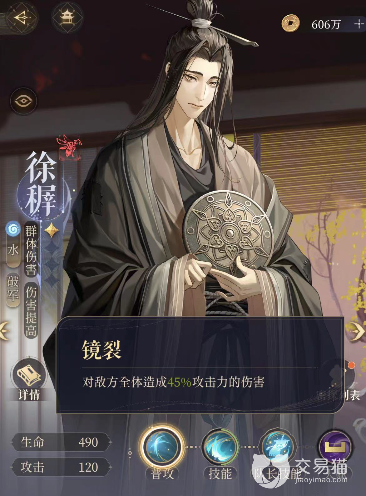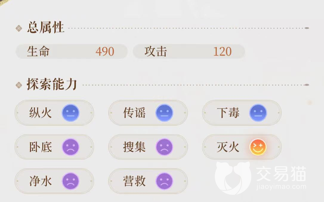 徐稺是水属性破军,技能定位群体伤害与伤害提高,探索能力最擅长灭火,其他探索能力表现一般。基础白板数值:生命值490,攻击力120。
