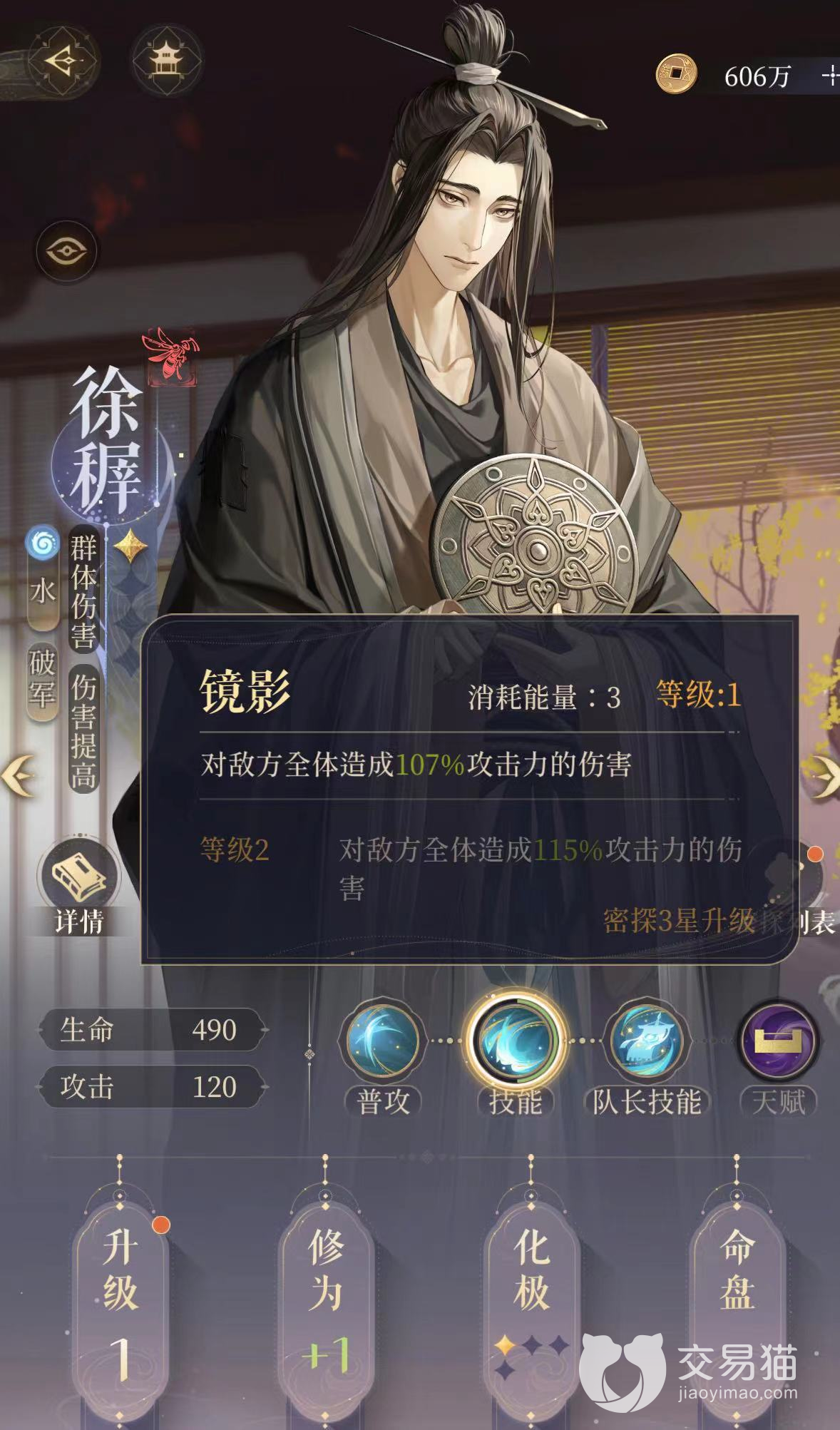 大招技能:镜影。消耗三点能量值,对全体敌方造成107%的攻击力的伤害。密探三星升级等级2,对全体造成115%倍率伤害。