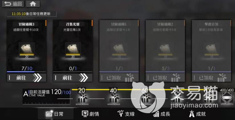 活跃度的提升方式其实十分简单,主要完成了每日任务就可以获得了,而玩家们分别可以在20到100这五个活跃度区间领取到不同等级的奖励,奖励中除了有可以供光灵升级的荧玉以及购买货品所需的白夜币外,还有着可以用来抽卡的光珀哦!当玩家们几天的努力累积下来,积攒到400活跃度还可以获得最大的礼包奖励,里面则是会为玩家提供精炼装备所必须的“卓速”,所以,活跃度是十分重要的。
