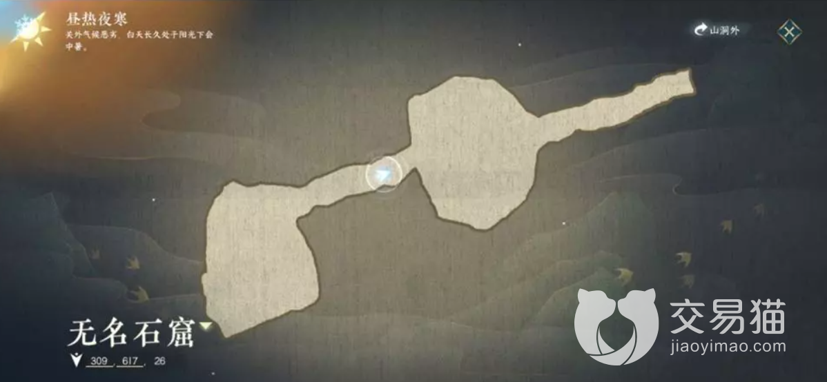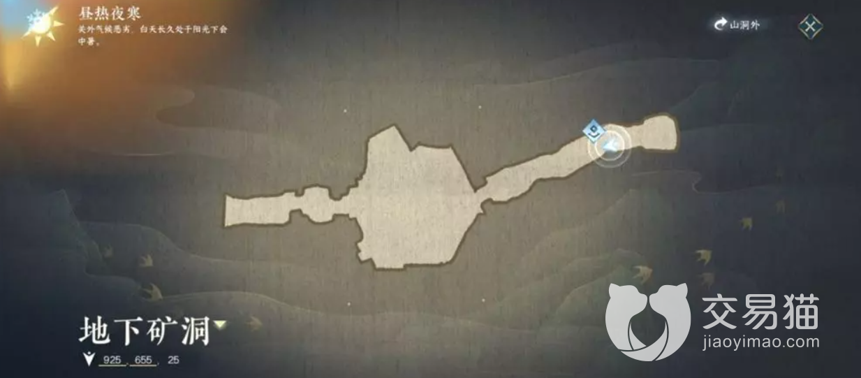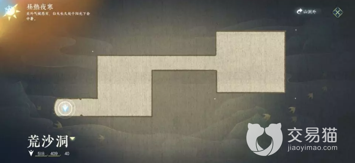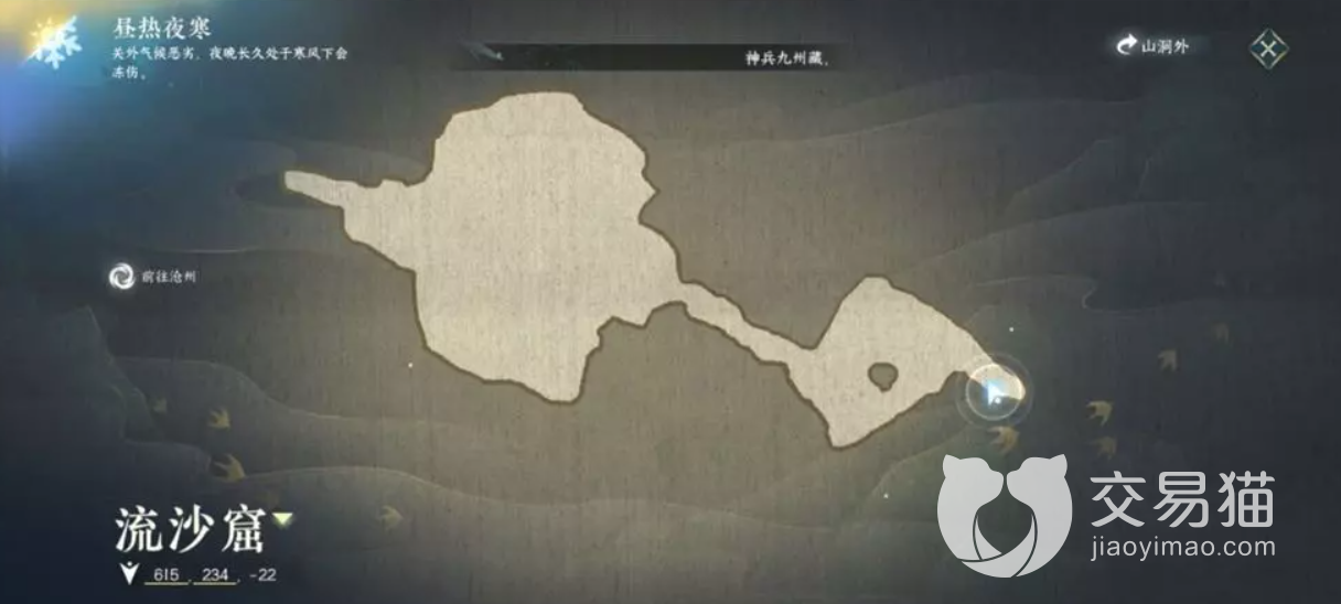 具体坐标在(615,231),也是本地图当中最大的洞窟之一。玩家们来到探索地点,会发现偌大的沙漠上会有一个木质板,外表其貌不扬,但玩家们互动进入之后,便别有洞天。随着剧情动画直接陷入底下之后,会来到洞窟真正的大门前,直接沿着路线前进即可。不过需要注意的是,建议各位玩家们带上承影剑进行探索,之后解谜过程中需要用到它。