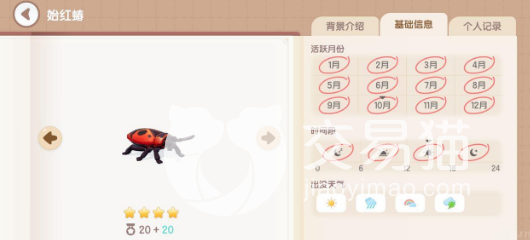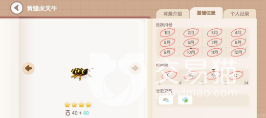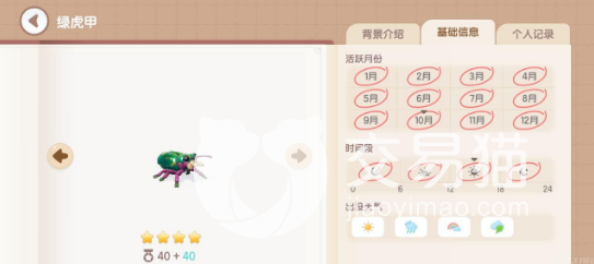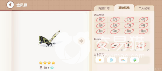 比如说金凤蝶是一个四星昆虫,分数值是40加40,每年12个月都是它的活跃月份,并且抓捕的时间段也是不局限大家的,全天都可以抓捕,周末天气也是不局限,并且在地图上是全图可见的,也是作为新手小编比较推荐大家去抓的。