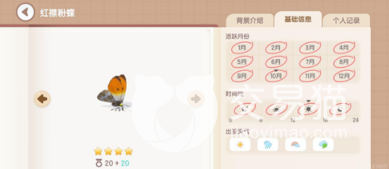 第三个叫红襟粉蝶,也是一个新手非常容易看见的蝴蝶,分值是20加20的4星,目前来看很容易抓捕,没有什么其他的要求。