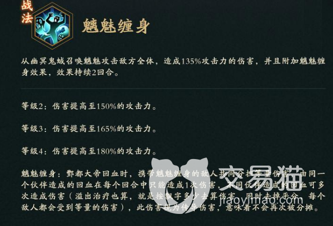 酆都尖帝技能介绍:他的战法是魑魅缠身,在对战的时候,他能够在幽冥界之中召唤出魑魅,对敌人全体进行攻击。普攻是摄魂,可以利用这个法术,对敌人带来一些攻击性的伤害,其中一些伤害还会直接转变成他的生命恢复。被动技能是魑魅诡雷,这个技能可以把那些魂魄直接转化成攻击的力量。觉醒是进退自如,他在对那些鬼魂进行处理的时候,能进也能退。