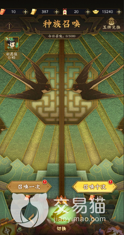 想要在这个游戏里面获得,酆都尖帝这个角色那么就要学会使用抽卡系统。不管玩家在游戏里面选择哪一种抽卡方式,都需要消耗一定数量的元宝。不同的地方就是在普通卡池里面,抽奖券可以用元宝进行兑换。还有一种方法就是种族召唤,但是对于玩家购买种族召唤券的次数有限制。每个星期只可以用5折的元宝去买10张券,这个难度是很高的。