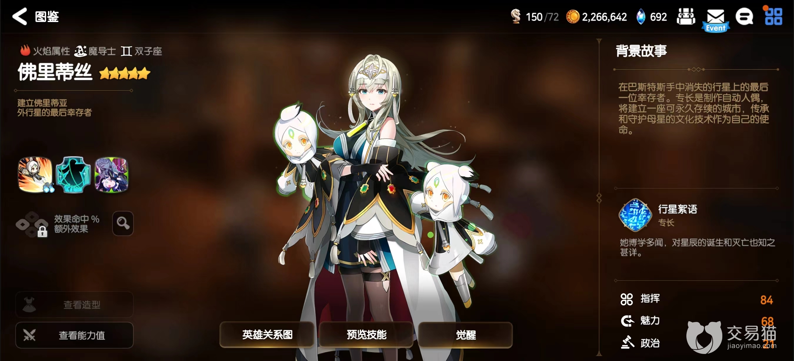 佛里蒂丝是火属性的魔导士,并非是输出类型角色,拥有的控制能力极强,大家在竞技场玩法中应该会遇到,技能效果更偏向PVP。角色都拥有3个技能,普攻、战技、大招。