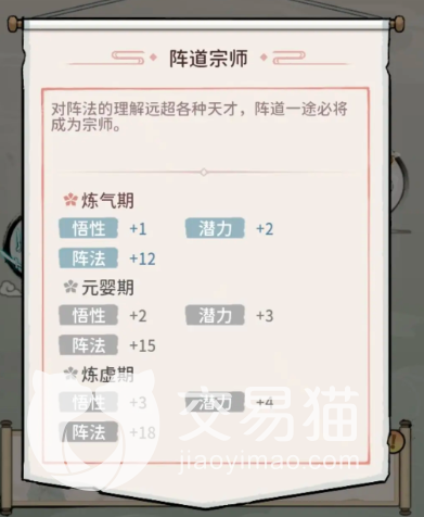 阵道宗师:潜力这块所有天赋都是一样的,该天赋的话主要还是有悟性和阵法上的优势,前者可以帮助玩家更快的参透新的功法,在成长速率上相对会更有优势,后者能够更快的开拓和巩固自己的阵法,从而确保上阵的弟子能够有着不俗的战力,另外该天赋在开封印宝箱的时候也会有额外的便利,不过前期开出来的都是一些法器,对弟子的实际提升有限,属于中规中矩的一个天赋。