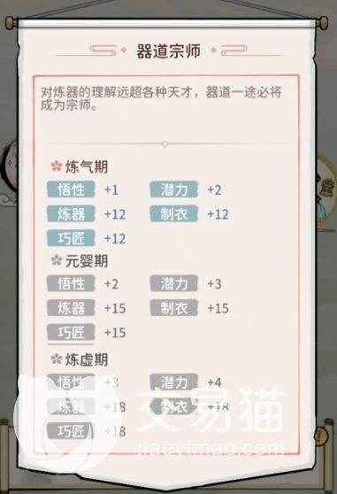 器道宗师:这一天赋提供的属性非常全面,除却基本的潜力以外,还能提供悟性,炼器,制衣和巧匠四种属性,这些可以在实际游戏过程中为你提供方方面面的便利,另外该天赋还会影响到后续15个法器格子的数量,格子越多,则可装备的法器数量越多,主角的实力上限因此也就进一步被拓宽,因此想要自己的主角后期强大那么该天赋是非点不可的。