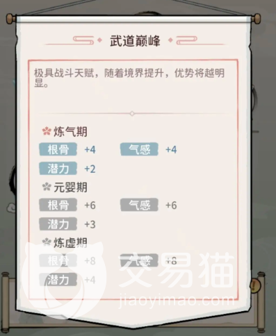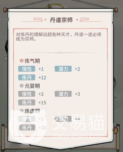 丹道宗师:主要是悟性和炼丹两方面比较不错,悟性的作用前面已经讲过,就是加快功法研习用的,炼丹的话则是提升丹药成功炼出的几率,它提升的几率还是比较可观的,而且很多丹药都可以在提升境界的时候起到较大帮助,所以如果你觉得自己的脸比较黑,或者想稳一下境界提升的话建议还是选一下为好,当然,如果是氪金玩家的话那么可以不用考虑,因为突破失败后无非就是再多费一些成本。