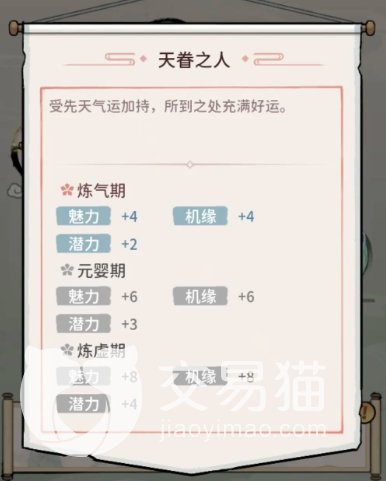 天眷之人:这个的话就是多一些额外的魅力和机缘,前者可以帮助你与其他npc进行社交,主要是用于提高劝说俘虏的成功率,俘虏中有一些值得留意的弟子能够收入麾下,不过只占极少数。机缘的话在秘境塔挂机的时候能够获得额外的一些资源收益,不过具体提升的几率和数量并不是很多,所以整体来看还是比较鸡肋的。