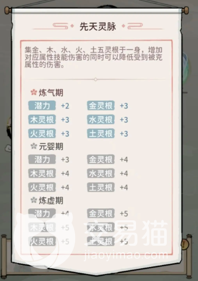 先天灵脉:这个天赋主要是针对五行灵根的加持,每个灵根都可以提供可观的加成,这些到后面可以让你在面对五行属性攻击时减少所受的伤害,因此变相等于增加了主角的承伤能力,当然,不点这个光靠根骨来撑的话也是可以站住脚的,所以主要看你把主角放在一个什么位置,如果只是想当肉盾工具人,那么还是建议点一下它。
