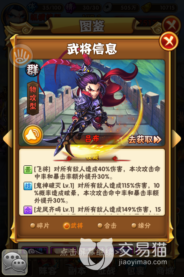 武将技能:紫色品质以上的名将和金色品质的神将都有多个能力,其中一个是大招,三个是被动。技能的升级需要消耗卷轴和铜币,铜币可以通过商城、野外流寇、梦回三国副本等方式获得,卷轴只能通过梦回三国副本获得。