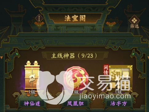 打开法宝界面可以看到主界面,名字叫法宝阁,在这里能够看到自己收集的所有法宝,比如神仙道、凤凰档胆、封神榜等等。除了这些之外,官方也为玩家设置了众多小游戏,有的法宝左上角有闲情这两个红色的字,点击之后就可以发现其中有各种类型的小游戏,完成之后可获得众多奖励。