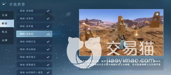 风音石:在一块荒漠中有几块大石头,它中间是镂空的,能发出声音,大家需要按照宫商角徽羽的方法将它们按照顺序摆放好,就可以演奏音乐了,点击大石头即可查找摆放顺序,它需要用的江湖技能是风。