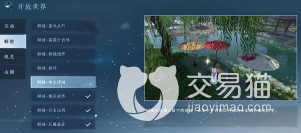 伞上诗迷:在河边大家能够看到一个伞,这个伞如果是关着的话,需要大家使用江湖技能水将伞打开,然后就能看到上面的诗谜了,接着跳上对应的字上就能通关了。或者也可以直接跳到红色伞上,连续跳就能拿到宝箱了。