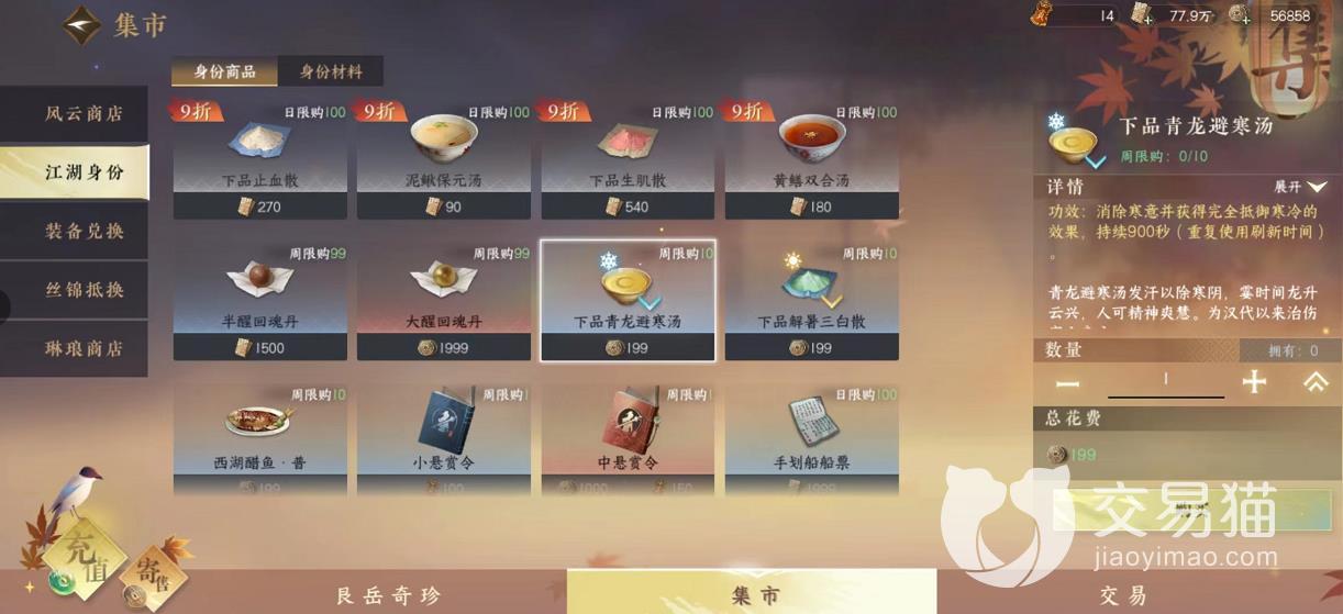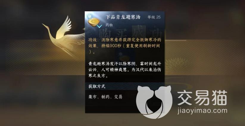 目前游戏内获取避寒汤的方法一共有两种,其中第一种就是通过购买获取,玩家们可以通过集市或者是交易板块搜索避寒汤,拥有多种避寒汤的品质,品质越高价格越高。玩家们是有一定的限购次数,一周最多可以限购十个,如果是在与玩家的交易过程中,那么这个就没有限制了。