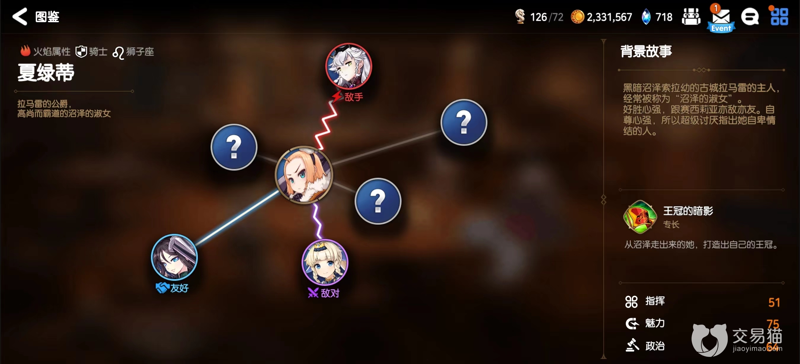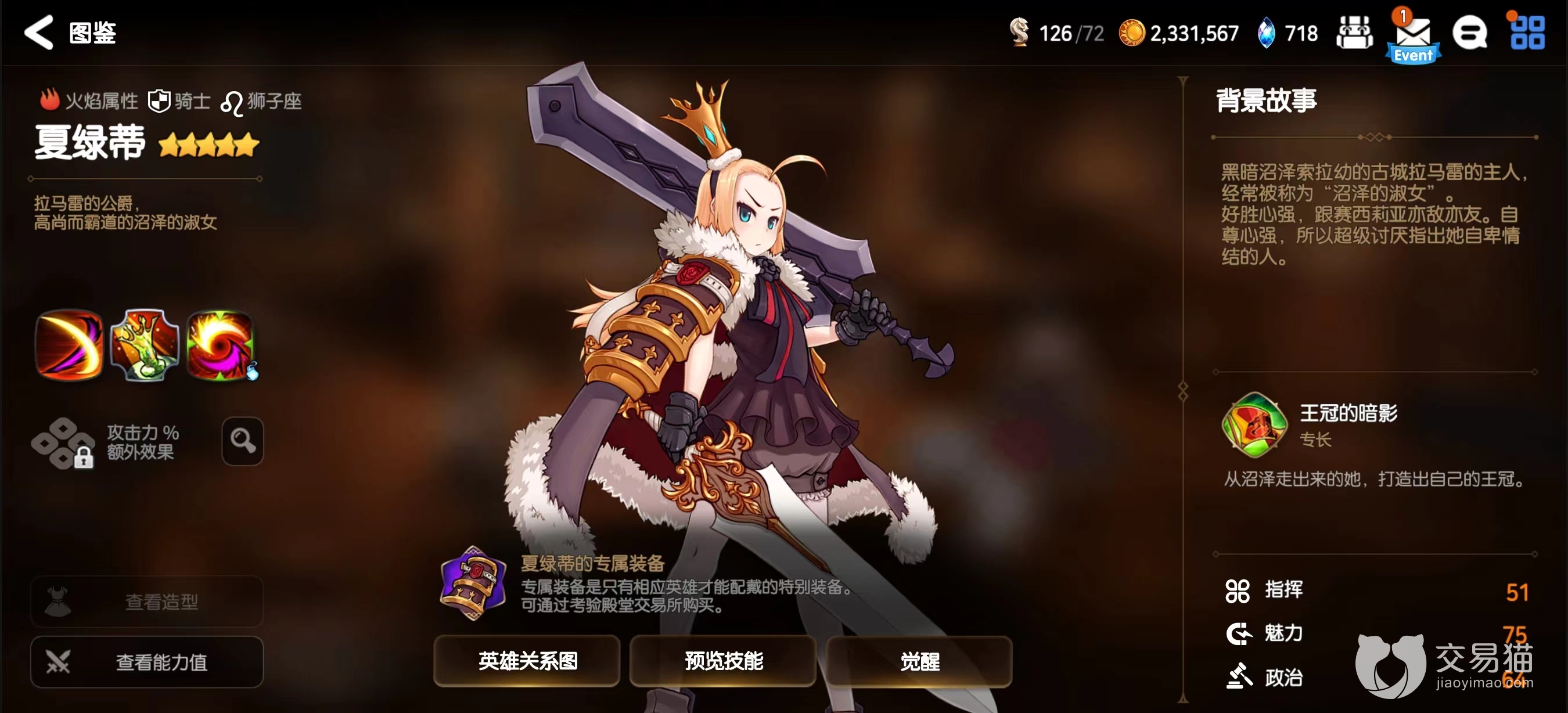 2.沼泽的意志,属于被动技能有一回合冷却,挨打就能获得10点斗志,同时提升50%的攻击、60%的防御,攻守兼备的效果,也让夏绿蒂这个前排有了一定的输出能力。