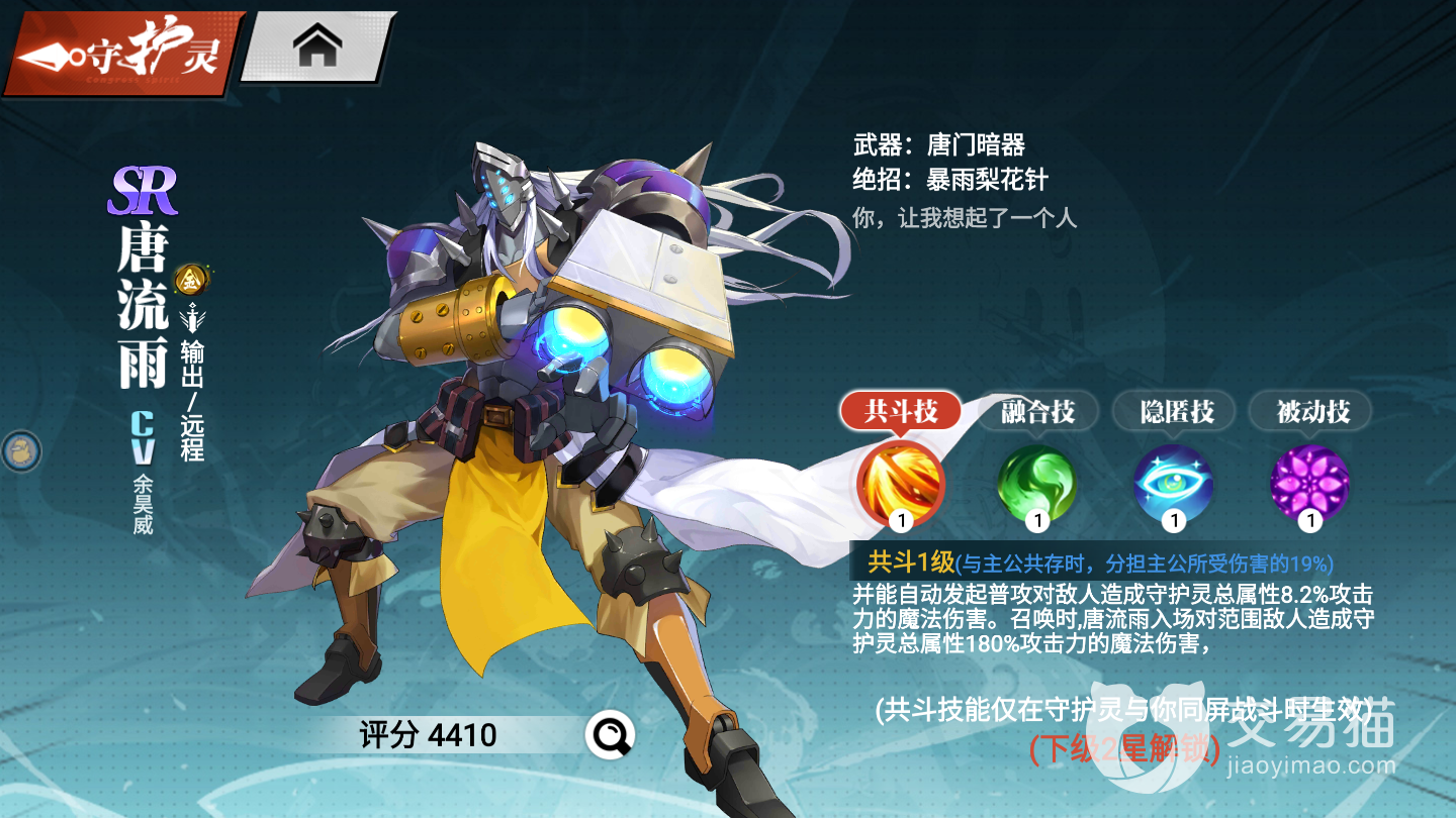 远程输出型守护灵,技能“暴雨梨花针”跳起滞空使用暗器连续攻击敌人,有破霸。技能“五毒元气弹”,通过蓄力释放的范围伤害技能,能令敌人受到中毒的效果,并破除霸体。技能“浮空冲击”,位移加击飞敌人追加空中持续攻击,也可以破霸体。特色是能使敌人中毒,可以搭配一些对中毒效果有加成的角色来发挥他的效果。被动“强化”,放在出战位或者被动位给主角带来164(327)点攻击力加成,这种直白的攻击加成在前期挺好用,但到后期这点儿是不够看的。