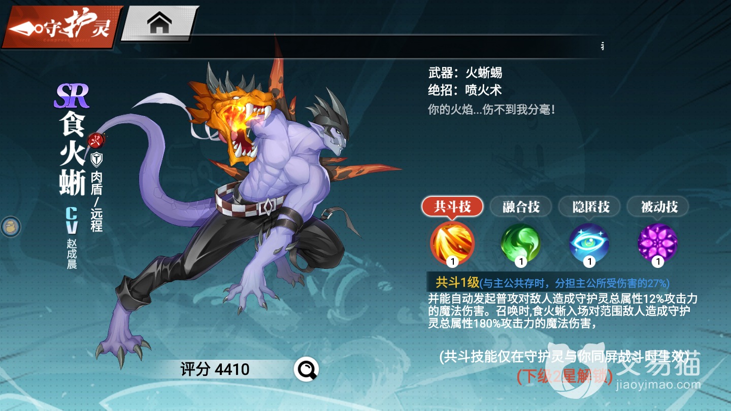 远程攻击型肉盾,定位还蛮有特色的。技能“喷火术”持续喷火造成伤害并破霸体。技能“火蜥来袭”,蓄力后释放火焰弹造成伤害并击飞,也可以破霸。技能“炎焱诀”使用后能在短时间内主角提升50%的暴击率。火蜥蜴的辅助技能是一大亮点,在我们使用一些高爆发的伤害技能时可以先点出辅助技能提升暴击率,然后再放大将伤害最大化。食火蜥的被动“火种”不管是主战位还是被动位都可以给角色提供暴伤减免。总的来看是一个非常顶用的守护灵,单体输出不断特别亮眼,但能给到主角很多增益。