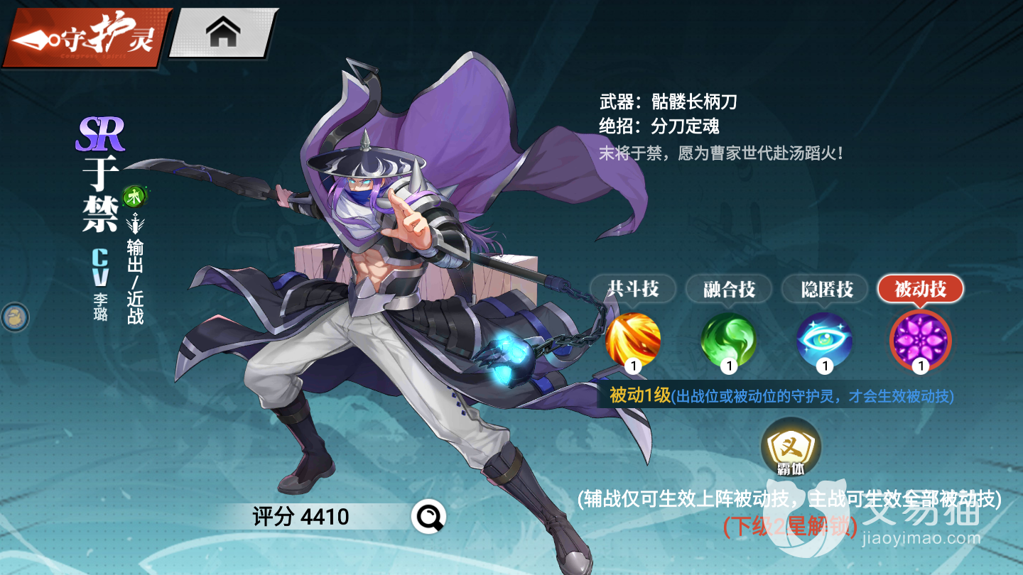 输出型近战,技能“取敌首级”蓄力向前突袭造成伤害并将敌人击飞。技能“破敌”腾空后跳2段伤害,最后重重的劈砍下来击飞敌人并造成高额伤害。技能“分刀定魂”前方连砍三下,造成浮空的效果。从他的隐匿技来看就是纯粹的输出守护灵,附带一些击飞的效果,前期作为出战能帮主角补补伤害。被动技能“忠义”,放在被动位上给主角提升180(360)的防御,稍微提升一下主角的坦度。