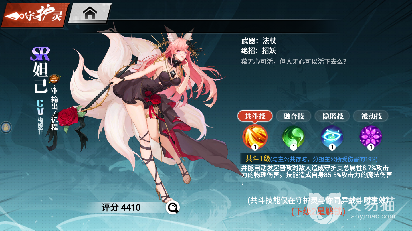 也是远程输出,九尾狐立绘蛮好看的。技能“灵狐”可以召唤狐狸环绕周围碰到的敌人受到伤害,攻击间隔0.6秒,同时也有破霸的效果。技能“魅惑之吻”,抛出飞吻,对命中的的敌人造成晕眩的效果,也可以破霸体。技能“招妖”,能召唤一个法阵其中有各种小动物然后不断地往前跑冲撞敌人造成伤害,伤害还挺高的也有破霸。兼顾输出和小控制的守护灵,搭配前排职业表现不错。被动技能“魅惑”放在被动位上能降低场上敌人最多0.5%的伤害,机制比较特殊,但降低幅度太低了,聊胜于无。