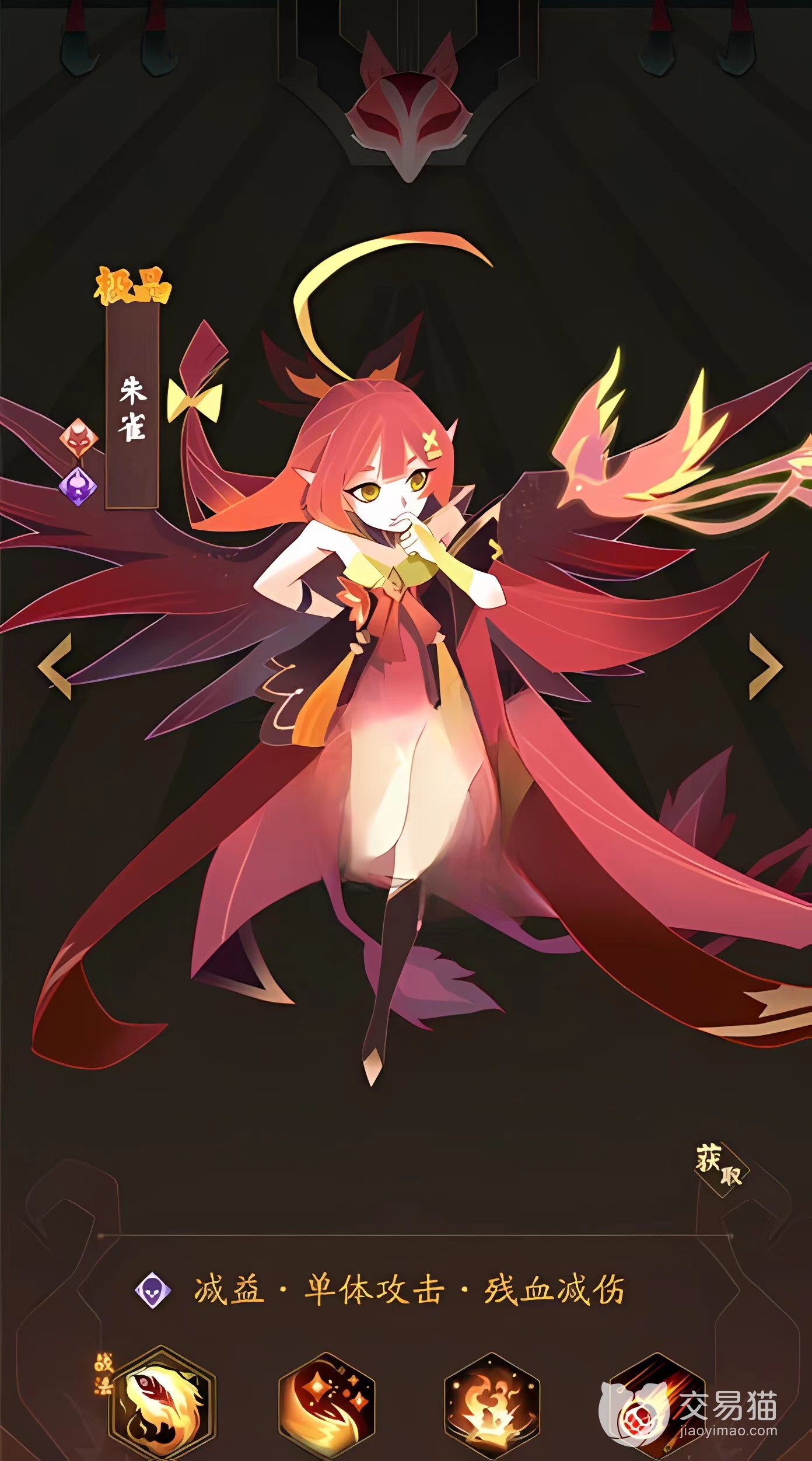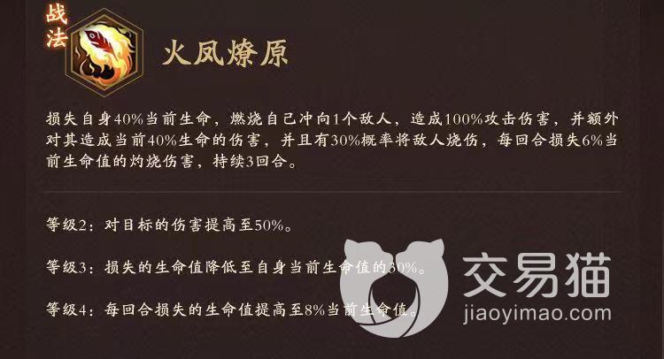 朱雀在游戏里面是一个火属性的角色,首先来讲一下他的战法,是火凤燎原,当在战斗的时候使用了这个技能的话,那朱雀就会瞬间变成一个火凤凰,直接对敌人进行攻击,而且会对敌方造成巨额的伤害力,还会附加一个灼烧效果,这个效果将会一直持续三个回合结束。