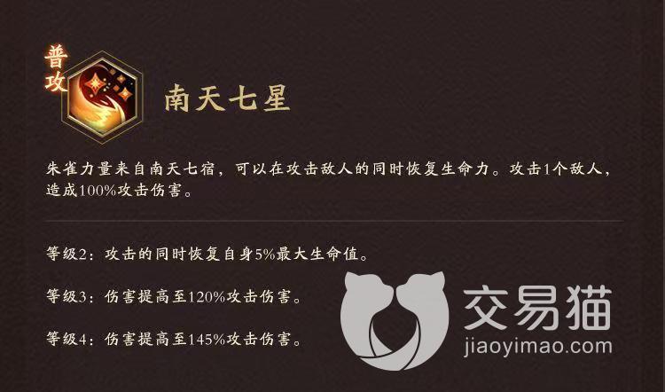 接下来就是普通攻击技能南天七星了,使用这个技能是可以在战斗的时候对敌人进行攻击的,同时还能将自身的生命值给回复,只要去攻击敌人,必定会受到伤害,他的被动技能是残火复明,在战斗过程中,如果朱雀被敌人攻击到,然后损失了生命值,那就可以触发到这个技能,这样不管敌人怎么对他进行攻击,所受到的伤害都会降低很多。